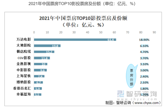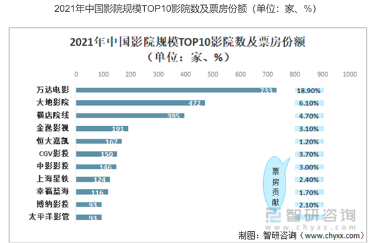根据智研咨询数据,2021年中国新建影院TOP10中,中影数字、万达院线、幸福蓝海新开业影院数量位居前三,新建影院数量分别为118家、86家、85家,横店影视以新增29家排名第9位。