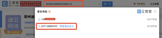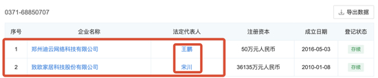 企查查搜索显示,电话号码为“0371-68850707 ”关联两个公司分别为“郑州迪云网络科技有限公司”法人王鹏和“致欧家居科技股份有限公司”法人为宋川。