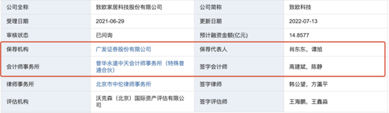 致欧家居此次保荐机构为广发证券股份有限公司(以下简称“广发证券”),保荐代表人肖东东,谭旭。广发证券是康美药业的上市主承销商,康美药业虚增营业收入约300亿元,虚增货币资金达886亿元的案爆发后,2020年7月,证监会也对广发证券给予了处罚。会计师事务所为立信会计师事务所(特殊普通合伙),签字会计师李振,汪文锋。 会计师事务所为普华永道中天会计师事务所(特殊普通合伙)签字会计师 高建斌,陈静。
