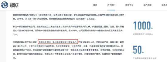 致欧家居官方网站介绍称“公司将发展立足于自主研发,先后设立郑州、洛杉矶和深圳设计研发中心,汇聚全球设计人才,不断地在产品上推陈出新,截至2021年3月31日,公司已经获得超过290项专利。为优化物流配送,公司在西欧、北美、日本及中国多地设立物流配送中心,总面积超过17万平方米,在公司自主研发的数字化管理系统支持下,物流体系可以高效覆盖主要市场。