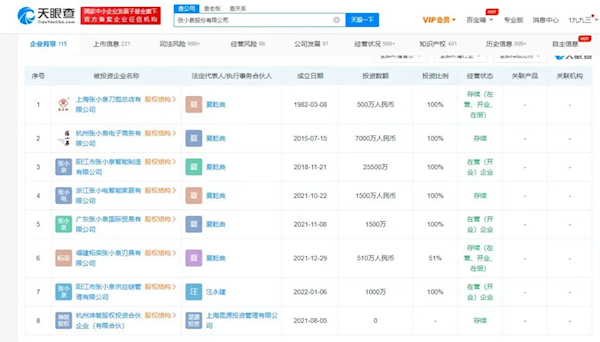 对外投资信息显示,张小泉股份有限公司共投资公司有8家,其中6家为全资持股,版图涉及张小泉旗下电子商务、智能家居、智能制造、国际贸易、供应链管理等。其3家分支机构中,仅张小泉股份有限公司杭州延安路分公司为存续状态。