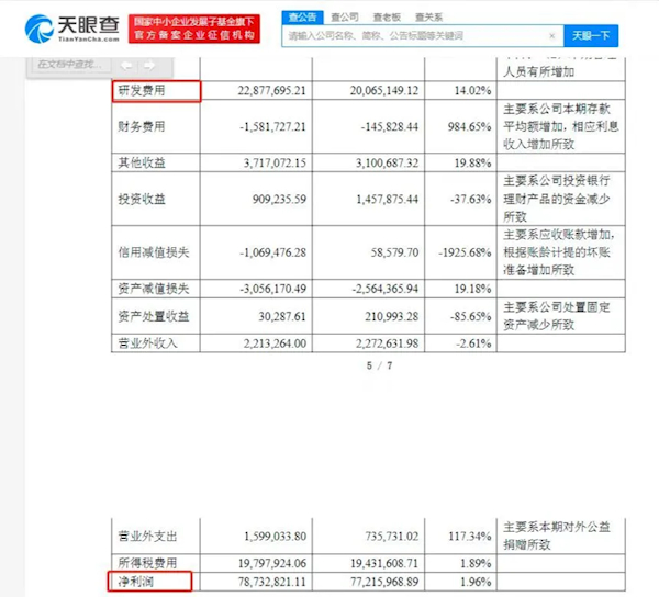 2021年,张小泉股份有限公司营业收入约7.60亿元,相比2020年增长32.81%;净利润约为7873万,相比2020年增幅为1.96%;研发支出2288万元,对比2020年增长14.02%。