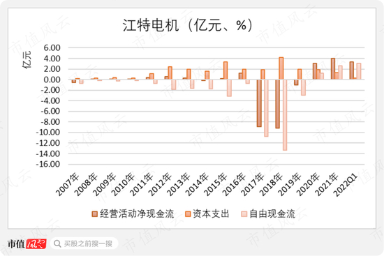 直到2020年,江特电机有所收敛之后,自由现金流才开始见好。