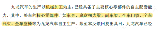 上市公司在公告中声称,九龙汽车具备主要核心零部件的自主配套能力,比如:车身、底盘扭力架、全车门锁、座椅等等。