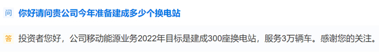 资料显示, 协鑫能科主营业务为清洁能源发电、热电联产、换电业务以及综合能源服务。近年来,公司在移动能源,也就是为电动汽车提供换电服务领域明显发力。公司2021年年报显示,公司已建成乘用车换电站9座,商用车换电站4座。而公司2022年的目标是建成300座换电站,服务3万辆车。