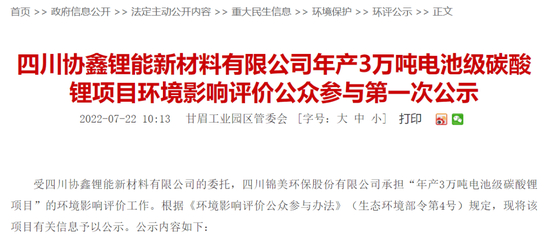 具体来看,眉山市政府于7月22日在其网站上发布了协鑫锂能年产3万吨电池级碳酸锂项目环境影响评价公众参与第一次公示公告,公示期为10个工作日。