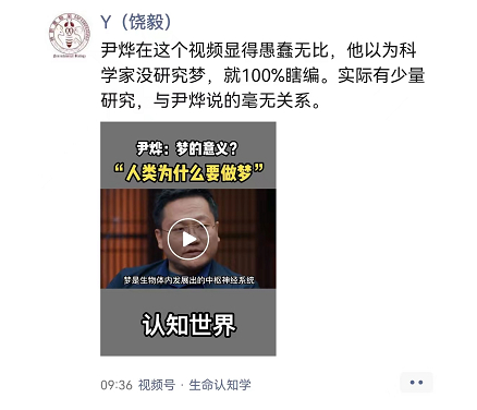 在另一个名为“生命认知学”的视频号中,尹烨谈及了“人类为什么要做梦”“爱因斯坦仅靠数学推测就预测了未来”等话题。对此,饶毅直指尹烨“愚蠢无比”“100%瞎编”“尹烨的物理是尹烨教的”……
