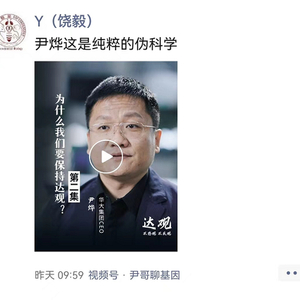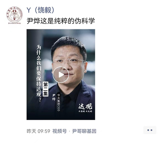 在“尹哥聊基因”视频号中,有一期题为“为什么我们要保持达观”的内容,转发、点赞达到10万+,尹烨在视频中表示,情绪可以影响人的基因表达,饶毅在转发该条内容时表示“尹烨这是纯粹的伪科学”。