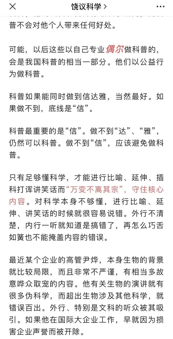 不仅在朋友圈内容中不断指出问题,饶毅还在其个人微信公众号平台发布的文章《信、达、雅:说起来容易 做起来…》一文中提到尹烨,称其“本身生物的背景就比较局限”“有相当多故意哗众取宠的内容”,有关生物的演讲内容存在“伪科学”,超出生物涉及其他科学的部分“错误百出”。