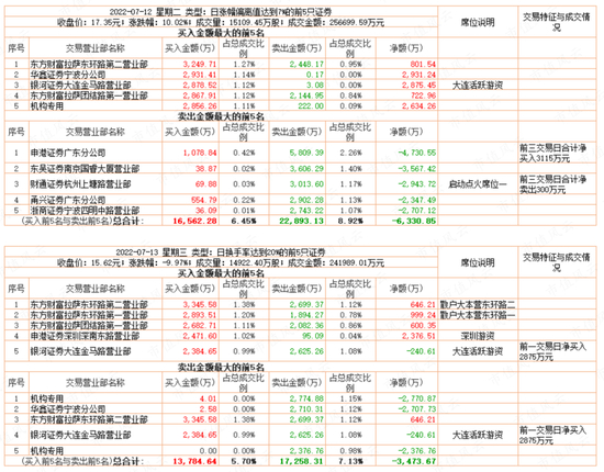 7月15至18日的龙虎榜数据显示,买一至买五席位全是“新”席位,行情开始的点火席位全部消失。并且是一家独大的买入,买二至买四席位的金额远远小于前者,说明市场多方均衡被打破了。