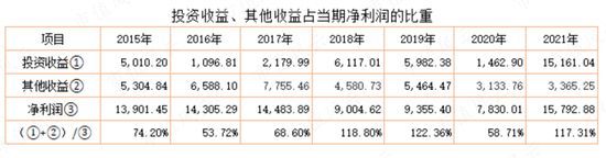 2015年以来,投资收益与其他收益合计占当期净利润的比重,最少的比值在54%,最高的达到122%。