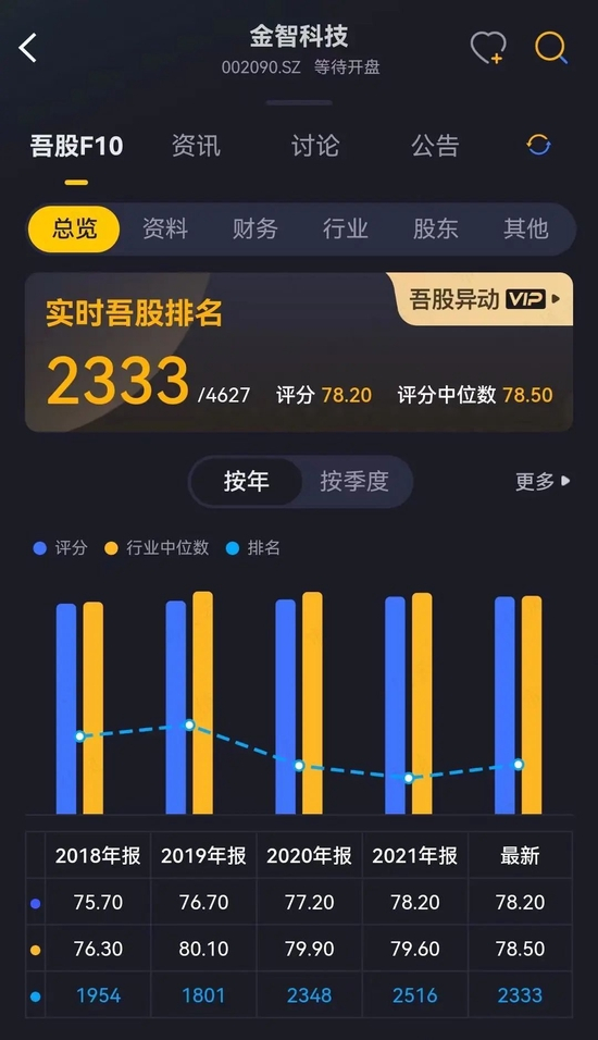 安装市值风云APP,可直接查看该公司的整体财务情况的评分及排名情况。