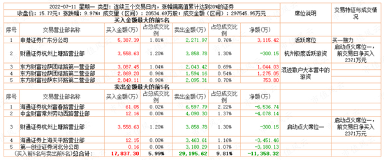 7月7日、8日、11日三天继续涨停,但振幅加大,成交量也大幅增加,期间的龙虎榜数据显示,点火席位中的财通证券杭州上塘路买入3559万元,卖出3859万元,以对倒为主。