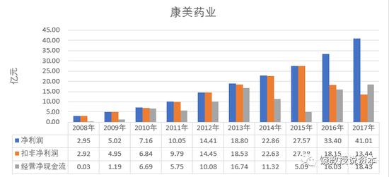 康美药业上市后,2001年-2007年,收入从3.81亿涨到12.94亿,归母净利润从0.29亿涨到1.46亿,初具规模。2008年开始业绩加速增长,到2017年达到鼎盛,收入264.77亿,净利润41亿,2008-2017年这10年,收入年复合增长率39%,净利润年复合增长率40%,妥妥的业绩大白马。