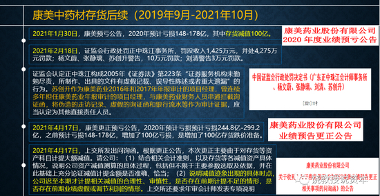 2021年4月17日,康美更正预亏公告,2020年预计亏损预计亏损244.8亿-299.2亿,之前预计亏损148-178亿,增加了100亿亏损,是增加了100亿存货跌价准备,这回一次计提204亿存货减值准备。之前立信2020年审计报告中,2018年追溯调整增加的中药材存货209.80 亿元,这两个数据接近了。