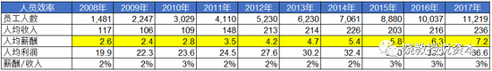 第四,看看人效,人均收入利润都很可观,可是人均薪酬却十分可怜,有点不对劲。