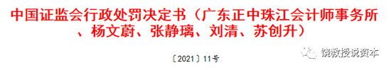 2021年2月18日,证监会行政处罚正中珠江事务所,罚没收入1,425万元,并处4,275万元罚款;杨文蔚、张静璃、苏创升警告,10万元罚款。杨张两人是签字合伙人,苏是康美项目经理直接操办。