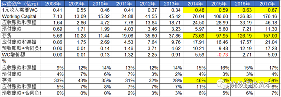 第三,看working capital,wc,营运资金,2014年之后营运资金需要量大增,1元收入需要WC从2013年的0.34,增加到2017年的0.67,按理说优势地位通常会在WC上占便宜,康美却没有优势,WC占款还越来越重,主要是存货越来越多,存货多,我们该警惕什么,对了,存货减值充分吗?