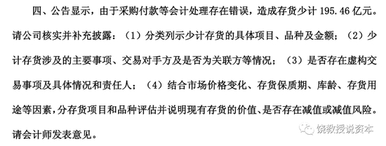 当日,2021年4月17日,上交所发出问询函。根据更正公告,本次更正主要由于对存货等资产科目计提大额减值。请公司:(1)结合相关会计准则,以及存货等各减值资产具体情况,说明公司资产减值测算的具体过程,包括但不限于主要参数选取及依据,并在此基础上充分论证减值计提金额是否准确、恰当;(2)说明减值迹象出现的具体时点,公司迟至本期才计提相关减值的合理性、审慎性,是否存在前期计提不足的情形,是否存在前期业绩虚假或调节利润的情形。上交所还要求年审会计师发表专项说明。