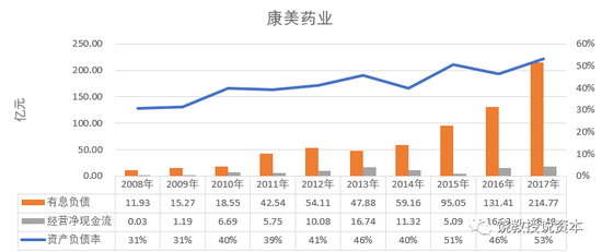 不过看看有息负债,还是有点小紧张,虽然2017年资产负债率只有53%,也不算高,有息负债214亿,其中银行借款114亿,债券83亿,而当年经营现金流只有18亿。