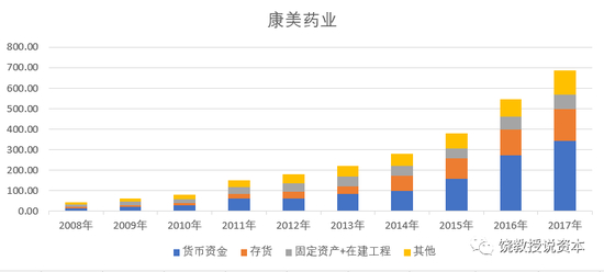 除此之外,康美在2017年之前资产质量,从表上看也没什大问题。资产以流动资产为主,2017年流动资产占比82%,而流动资产中主要是货币资金和存货,2017年底账面现金高达341.41亿,占总资产的50%。如果现金是真的,这资产质量杠杠的,可惜,梦一场。