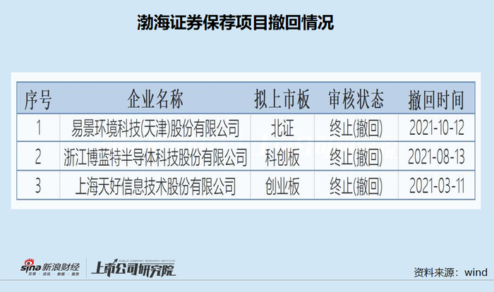 渤海证券3家撤回的保荐项目分别为易景环境科技(天津)股份有限公司(易景环境)、浙江博蓝特半导体科技股份有限公司(博兰特)、上海天好信息技术股份有限公司(天好信息)。