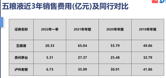 销售方面,五粮液在不断的砸钱,2019年销售费用将近50个亿,但是到了2021年一下飙到65个亿了。到了2022年一季度一个季度就用了20亿。
