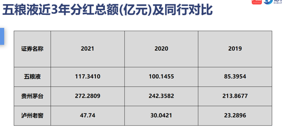 五粮液分红也是年年的增加,2019年分红85个亿,到了2021年分红超过117亿,而贵州茅台由2019年的213亿飙升到了2021年的272亿。
