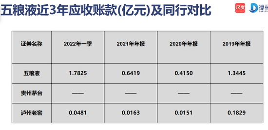 那我们看看应收账款,白酒有没有应收账款,几乎没有。但是五粮液为什么2019年有1.3亿到2022年一季度有1.78亿?因为他有低端酒,当然不是一手交钱一手交货。