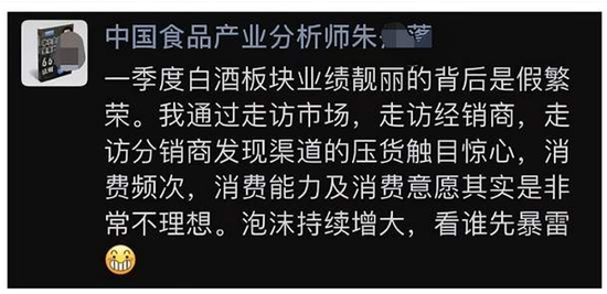 那么很多人,现在的白酒啊没人喝那就是个虚假繁荣。尤其是这个食品饮料的分析师说,一季度白酒板块业绩靓丽的背后是虚假繁荣,他说他通过走访市场经销商,发现渠道的压货是触目惊心,消费能力以及消费意愿其实是非常不理想。