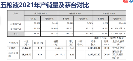 我们再看一下,五粮液在2021年的产销量和茅台对比,先看产量,五粮液产品是2.8万吨,同比增加了9.46%。系列酒是16万吨,增加了20%,合计平均增18%。