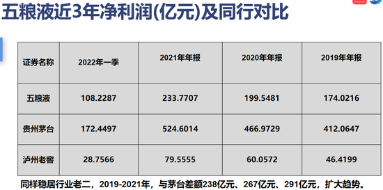 利润来看,五粮液2019年174亿,飙升到2021年的233亿,这利润好赚钱,一个季度就赚了100亿。