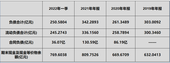 从2019年来看,303亿的负债中,有300亿是流动负债,也就是一年期的到期的负债,基本占比90%多。到了2022年一季度,250亿的负债里边有245亿的流动负债。