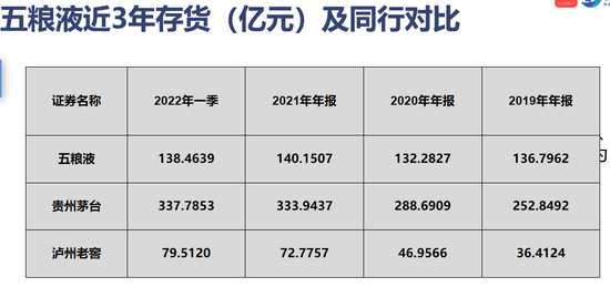看看存货,五粮液 2019年是136亿,这几年存货一直维持的非常的稳定。而茅台存货从2019年的252亿到现在飙升到了2022年一季度的337亿。