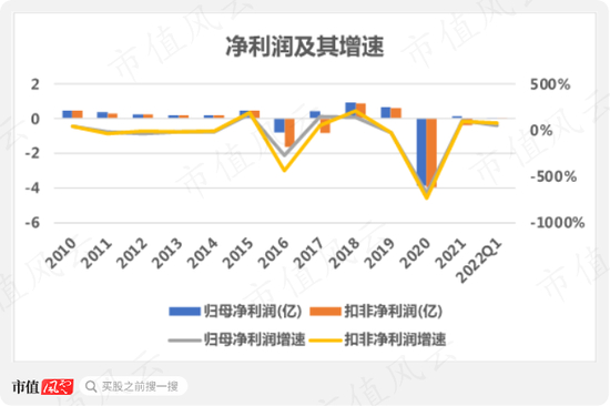 2010-2020年,公司在前两任实控人的带领下,总营收有小幅增长,但2020年被打回原形,不足5亿,同比下降40.8%。