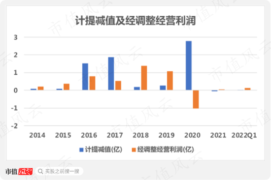2014-2022年一季度,经调整经营利润为3.5亿,同期计提减值高达6.7亿。
