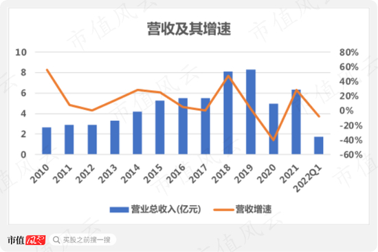 2021年新实控人上位后情况有所好转,营收为6.3亿,同比增速为28%。2022年一季度为1.7亿,基本与去年持平。