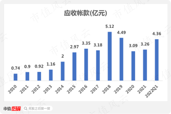公司应收帐款(包含应收票据及应收款项融资)2010年为0.74亿,到2022年Q1已经上升至4.36亿。2010-2021年的CAGR也达到了13.2%,而同期的营收增速却仅为7.4%。