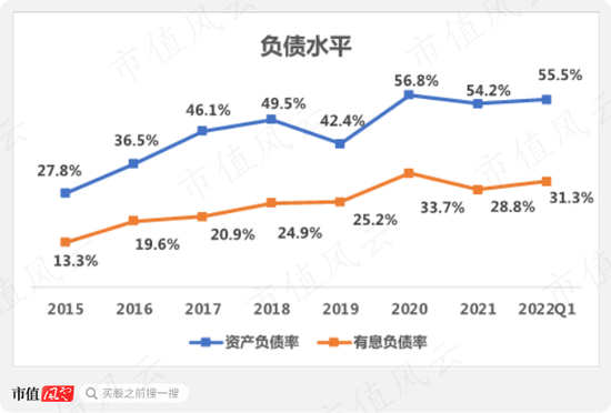2022年一季度,公司账面货币资金只有不到6000万,还背着4.5亿的有息借款。公司的负债水平在逐年走高,同期资产负债率已经高达55.5%,有息负债率为31.1%。