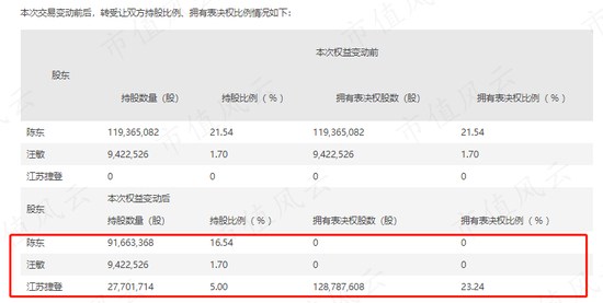 当时陈东及其妻子持有公司23.24%的股权,二者将其中的5%进行协议转让,并将剩余18.24%对应的表决权转让给江苏捷登智能制造科技有限公司(以下简称“江苏捷登”),终于成功“卸任”实控人。