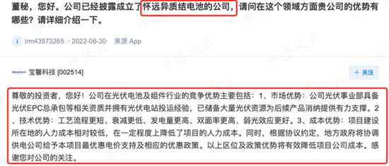 首先在消息面上,宝馨科技近一个月频繁有匿名投资者在互动易提问,问公司是否有HTJ电池、锂电池、光伏、机器人、新能源汽车、虚拟电厂……等时下热点的布局。