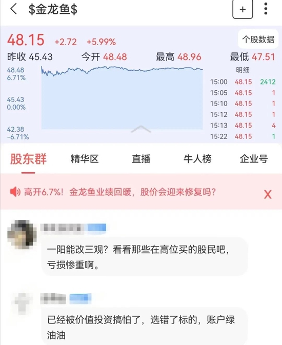 在尺度股东群,“一阳能改三观?看看那些在高位买的股民吧,亏损惨重啊”。还有投资者表示,“已经被价值投资搞怕了,选错了标的,账户绿油油”。