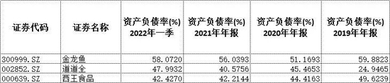 目前,金龙鱼的资产负债率为57.78%。而在今年一季度,该公司资产负债率为58.07%,高于道道全的47.99%和西王食品的42.42%。