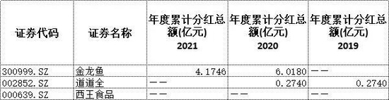 从股东回报情况看,2020年至2021年,金龙鱼分红金额分别约6亿、4.17亿。当然,它的同行们也分红不多,道道全三年分红金额不到5000万,西王食品一分钱没分给投资者。