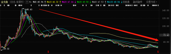 K线显示,金龙鱼自2021年1月11日创下145.43元高点后,便进入了漫漫熊途。当前股价与高点相比,累计跌幅约66.89%,总市值蒸发超5000亿元,相当于跌去了一个中国石化。
