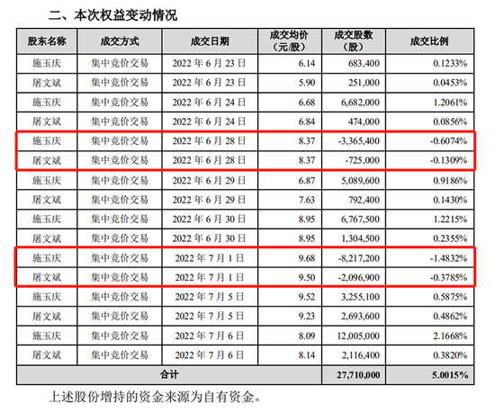 据披露,7月6日,屠文斌与施玉庆通过集中竞价方式增持公司股票1412.14万股,约占公司总股本的2.5488%。此次增持后,屠文斌、施玉庆合计持有公司股份2771万股,约占公司总股本比例为5.0015%。