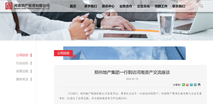据河南资产官网消息,7月19日,郑州地产董事长万永生一行到访河南资产。双方一致表示,将联合设立郑州市地产纾困基金,通过资产处置、资源整合、重组顾问等方式,参与问题楼盘盘活、困难房企救助等解围纾困工作。
