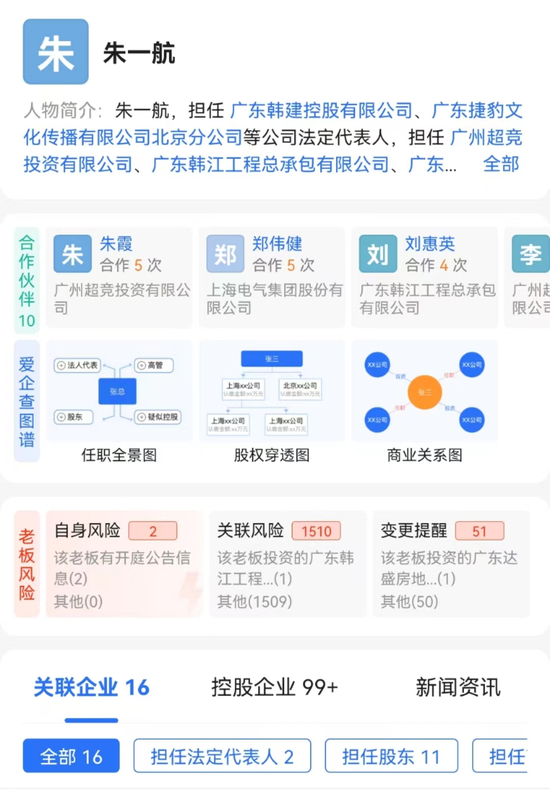 据爱企查显示,朱一航目前关联企业16家,担任2家企业法定代表人,控股企业117家,担任11家企业股东和7家企业高管。