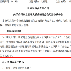 1.6亿元!比亚迪执行副总裁豪捐50万股做慈善,支持血液病研究