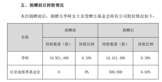 本次计划捐赠数量占总股本比例为0.02%,将拟以协议转让(非交易过户)的方式进行。捐赠前,李柯持股数量为1092.14万股,持股比例0.38%;捐赠后持股1042.14万股,持股比例0.36%。比亚迪慈善基金会的持股比例将上升至0.02%。